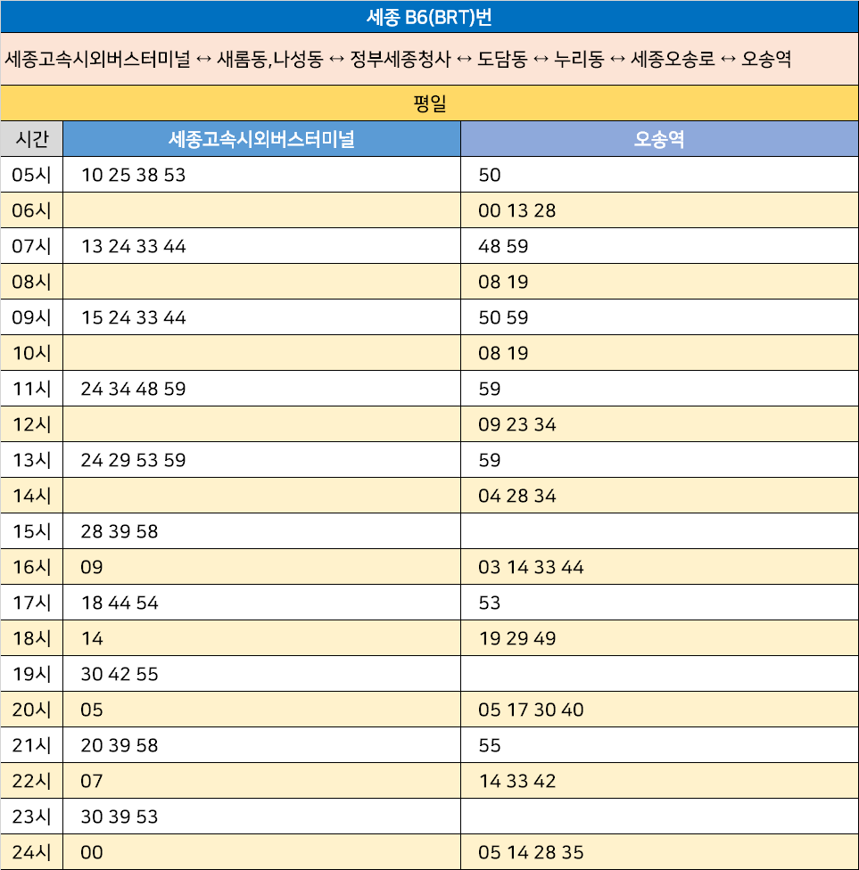 세종 B6(BRT)번: 세종고속시외버스터미널 ↔ 새롬동,나성동 ↔ 정부세종청사 ↔ 도담동 ↔ 누리동 ↔ 세종오송로 ↔ 오송역