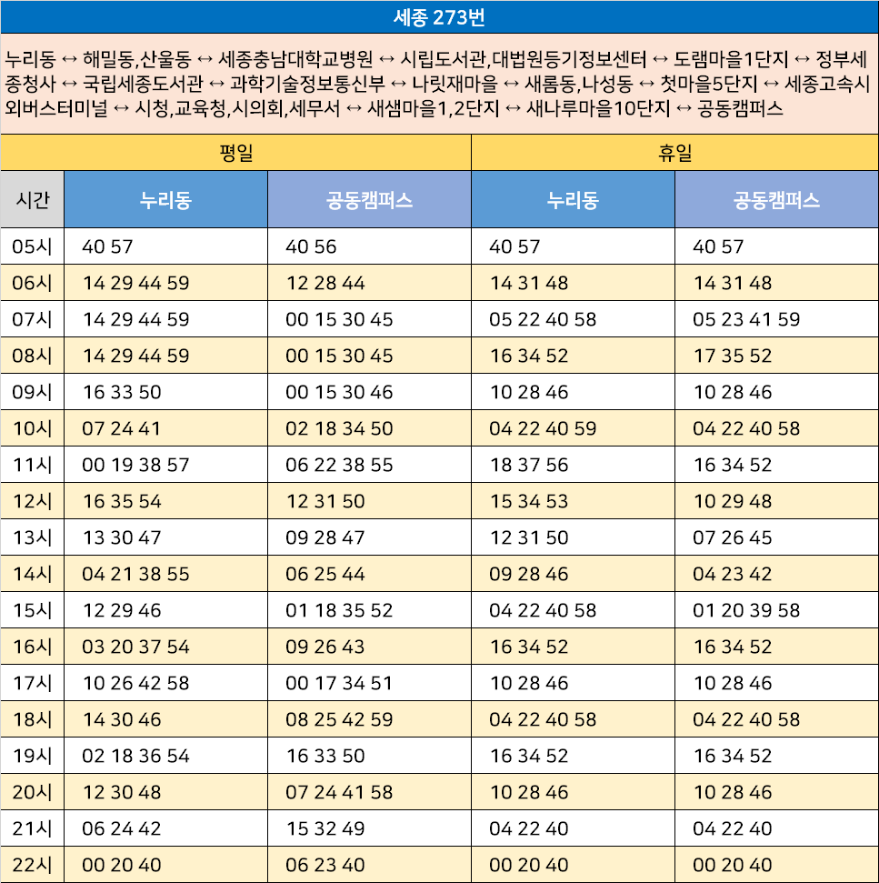 세종 273번: 누리동 ↔ 해밀동,산울동 ↔ 세종충남대학교병원 ↔ 시립도서관,대법원등기정보센터 ↔ 도램마을1단지 ↔ 정부세종청사 ↔ 국립세종도서관 ↔ 과학기술정보통신부 ↔ 나릿재마을 ↔ 새롬동,나성동 ↔ 첫마을5단지 ↔ 세종고속시외버스터미널 ↔ 시청,교육청,시의회,세무서 ↔ 새샘마을1,2단지 ↔ 새나루마을10단지 ↔ 공동캠퍼스