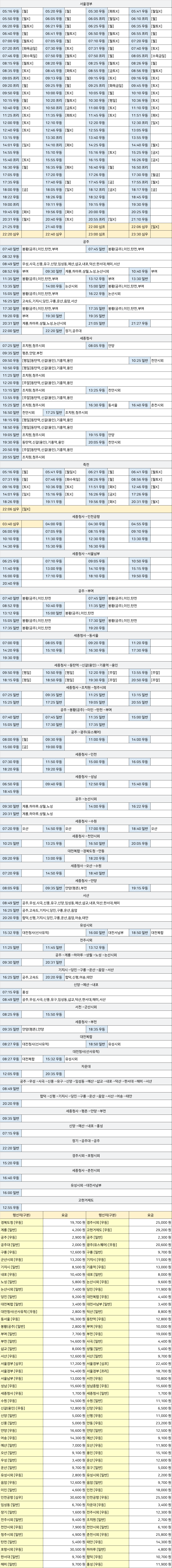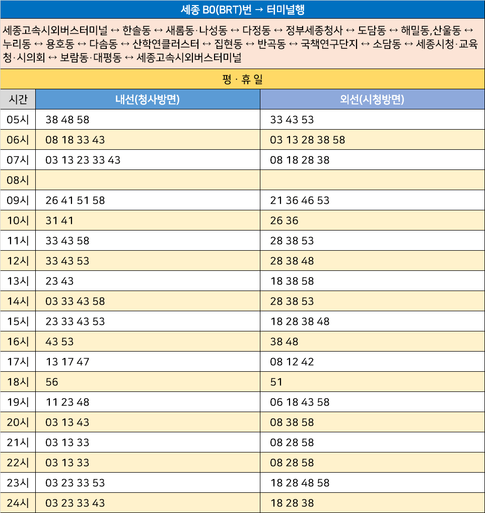 세종 시외버스 터미널 시간표/요금표 2025년 04월 01일 기준