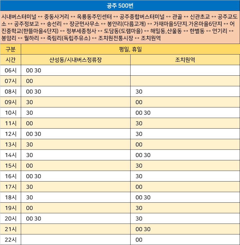 공주 500번: 시내버스터미널 ↔ 중동사거리 ↔ 옥룡동주민센터 ↔ 공주종합버스터미널 ↔ 관골 ↔ 신관초교 ↔ 공주교도소 ↔ 공주정보고 ↔ 송선리 ↔ 장군면사무소 ↔ 봉안리(다름고개) ↔ 가재마을5단지.가온마을6단지 ↔ 어진중학교(한뜰마을4단지) ↔ 정부세종청사 ↔ 도담동(도램마을) ↔ 해밀동,산울동 ↔ 한별동 ↔ 연기리 ↔ 봉암리 ↔ 월하리 ↔ 죽림리(독립주유소) ↔ 조치원전통시장 ↔ 조치원역