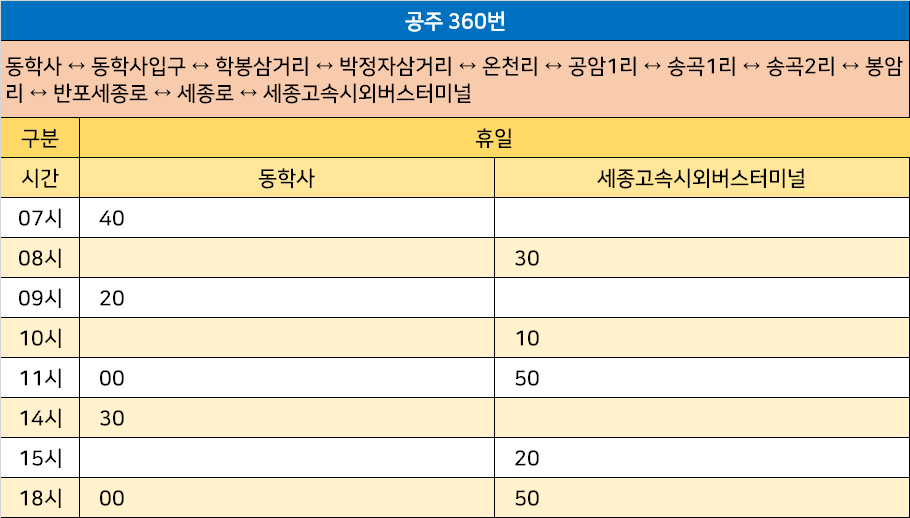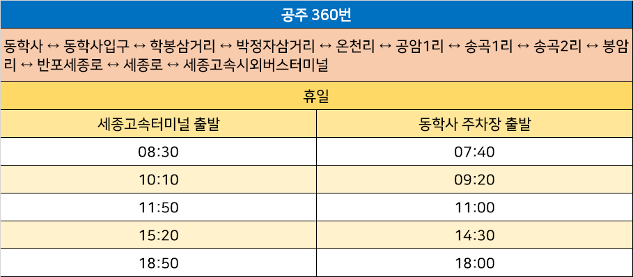 공주 360번: 동학사 ↔ 동학사입구 ↔ 학봉삼거리 ↔ 박정자삼거리 ↔ 온천리 ↔ 공암1리 ↔ 송곡1리 ↔ 송곡2리 ↔ 봉암리 ↔ 반포세종로 ↔ 세종로 ↔ 세종고속시외버스터미널