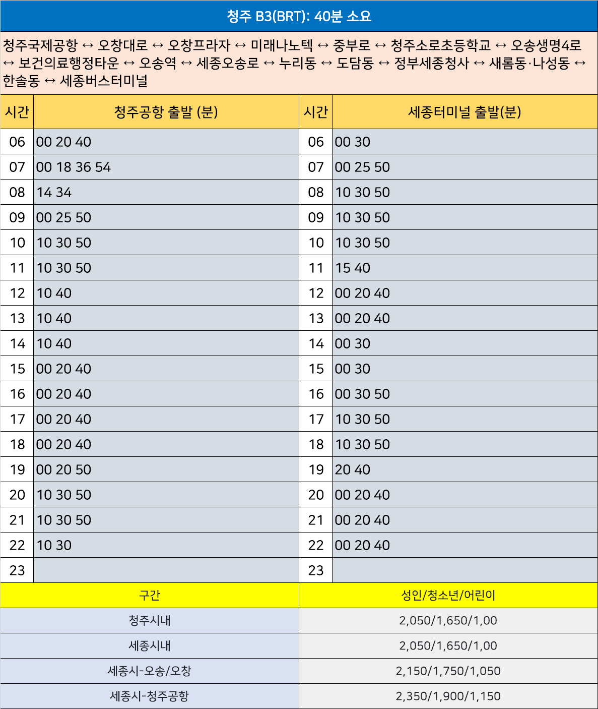 청주 B3(BRT) : 청주국제공항 ↔ 오창대로 ↔ 오창프라자 ↔ 미래나노텍 ↔ 중부로 ↔ 청주소로초등학교 ↔ 오송생명4로 ↔ 보건의료행정타운 ↔ 오송역 ↔ 세종오송로 ↔ 누리동 ↔ 도담동 ↔ 정부세종청사 ↔ 새롬동·나성동 ↔ 한솔동 ↔ 세종버스터미널