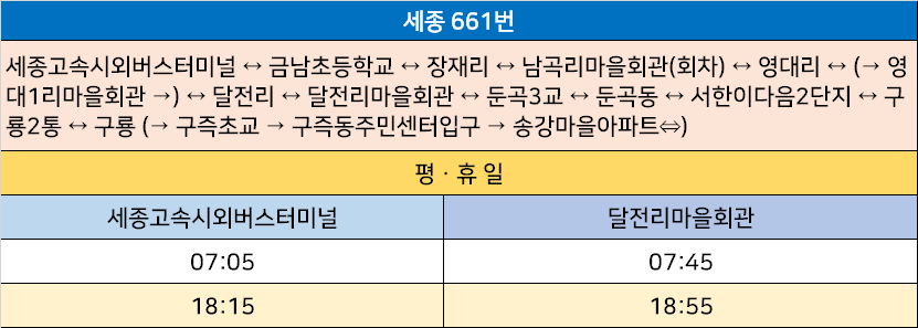 세종 661번: 세종고속시외버스터미널 ↔ 금남초등학교 ↔ 장재리 ↔ 남곡리마을회관(회차) ↔ 영대리 ↔ (→ 영대1리마을회관 →) ↔ 달전리 ↔ 달전리마을회관 ↔ 둔곡3교 ↔ 둔곡동 ↔ 서한이다음2단지 ↔ 구룡2통 ↔ 구룡 (→ 구즉초교 → 구즉동주민센터입구 → 송강마을아파트⇔)