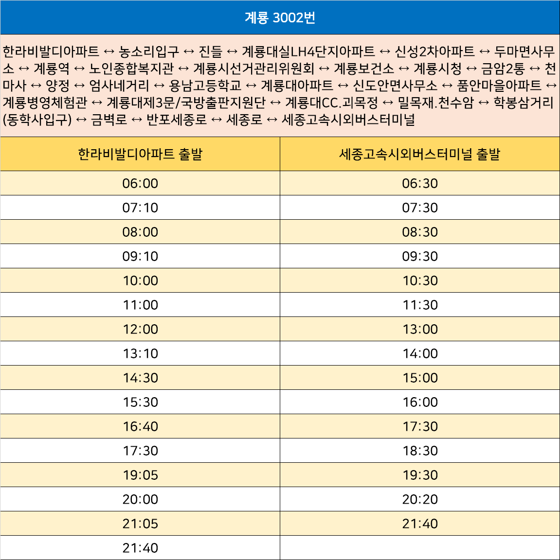 계룡 3002번: 한라비발디아파트 ↔ 농소리입구 ↔ 진들 ↔ 계룡대실LH4단지아파트 ↔ 신성2차아파트 ↔ 두마면사무소 ↔ 계룡역 ↔ 노인종합복지관 ↔ 계룡시선거관리위원회 ↔ 계룡보건소 ↔ 계룡시청 ↔ 금암2통 ↔ 천마사 ↔ 양정 ↔ 엄사네거리 ↔ 용남고등학교 ↔ 계룡대아파트 ↔ 신도안면사무소 ↔ 품안마을아파트 ↔ 계룡병영체험관 ↔ 계룡대제3문/국방출판지원단 ↔ 계룡대CC.괴목정 ↔ 밀목재.천수암 ↔ 학봉삼거리(동학사입구) ↔ 금벽로 ↔ 반포세종로 ↔ 세종로 ↔ 세종고속시외버스터미널