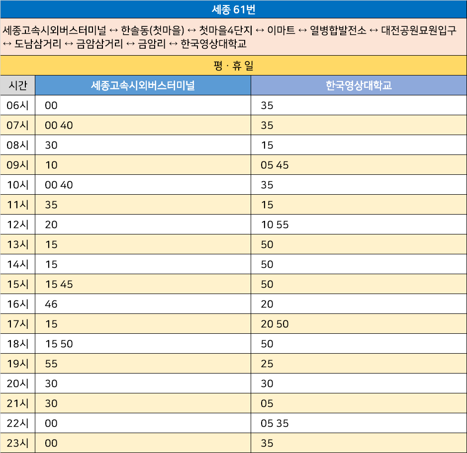 세종 61번: 세종고속시외버스터미널 ↔ 한솔동(첫마을) ↔ 첫마을4단지 ↔ 이마트 ↔ 열병합발전소 ↔ 대전공원묘원입구 ↔ 도남삼거리 ↔ 금암삼거리 ↔ 금암리 ↔ 한국영상대학교