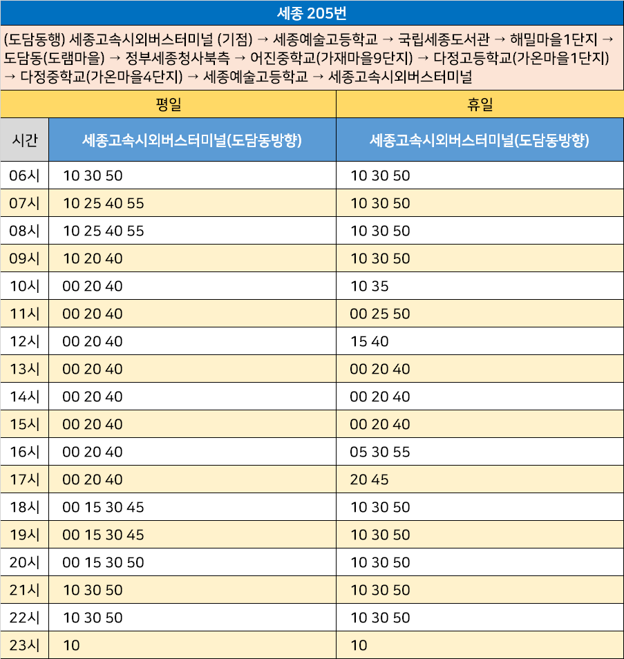 세종 205번: (도담동행) 세종고속시외버스터미널 (기점) → 세종예술고등학교 → 국립세종도서관 → 해밀마을1단지 → 도담동(도램마을) → 정부세종청사북측 → 어진중학교(가재마을9단지) → 다정고등학교(가온마을1단지) → 다정중학교(가온마을4단지) → 세종예술고등학교 → 세종고속시외버스터미널
