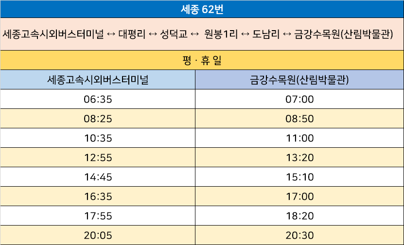 세종 62번: 세종고속시외버스터미널 ↔ 대평리 ↔ 성덕교 ↔ 원봉1리 ↔ 도남리 ↔ 금강수목원(산림박물관)