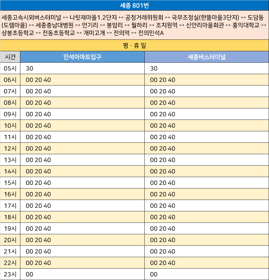 세종 801번: 세종고속시외버스터미널 ↔ 나릿재마을1.2단지 ↔ 공정거래위원회 ↔ 국무조정실(한뜰마을3단지) ↔ 도담동(도램마을) ↔ 세종충남대병원 ↔ 연기리 ↔ 봉암리 ↔ 월하리 ↔ 조치원역 ↔ 신안리마을회관 ↔ 홍익대학교 ↔ 상봉초등학교 ↔ 전동초등학교 ↔ 개미고개 ↔ 전의역 ↔ 전의민석A