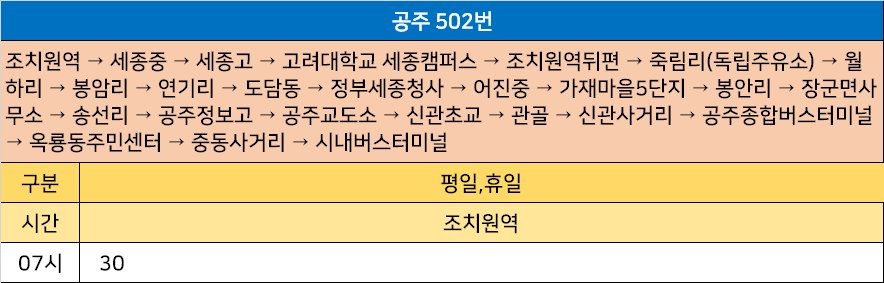 공주 502번: 조치원역 → 세종중 → 세종고 → 고려대학교 세종캠퍼스 → 조치원역뒤편 → 죽림리(독립주유소) → 월하리 → 봉암리 → 연기리 → 도담동 → 정부세종청사 → 어진중 → 가재마을5단지 → 봉안리 → 장군면사무소 → 송선리 → 공주정보고 → 공주교도소 → 신관초교 → 관골 → 신관사거리 → 공주종합버스터미널 → 옥룡동주민센터 → 중동사거리 → 시내버스터미널