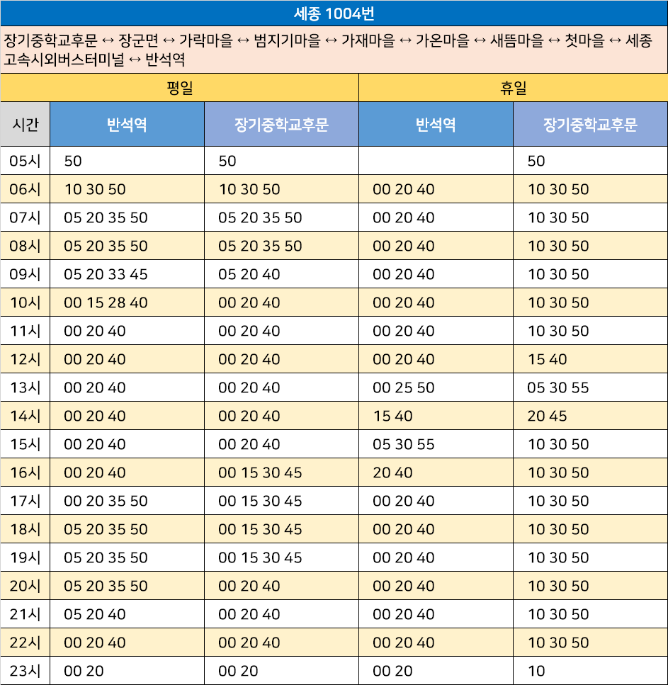 세종 1004번: 장기중학교후문 ↔ 장군면 ↔ 가락마을 ↔ 범지기마을 ↔ 가재마을 ↔ 가온마을 ↔ 새뜸마을 ↔ 첫마을 ↔ 세종고속시외버스터미널 ↔ 반석역