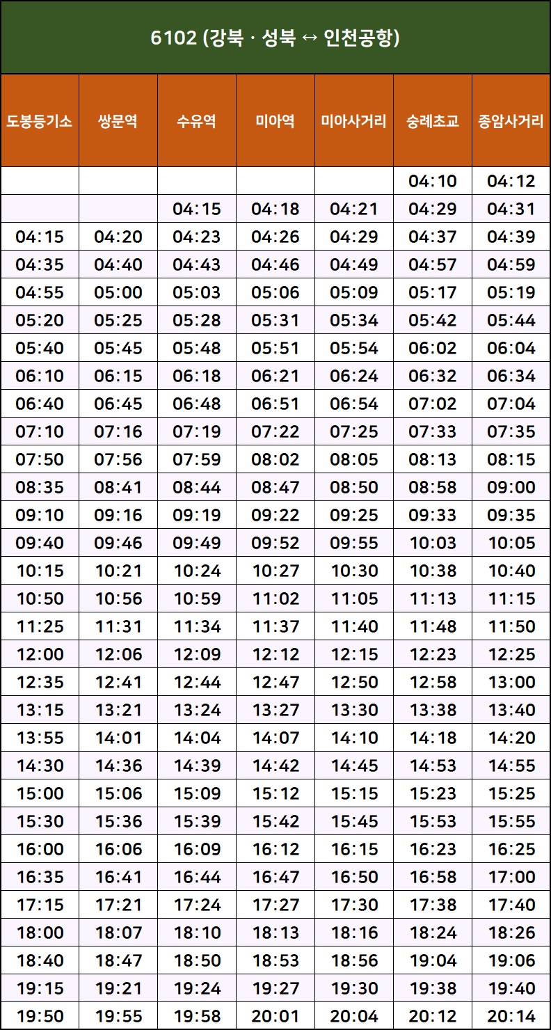 쌍문역 → 수유역 → 미아역 → 미아사거리역 → 숭례초교(고려대) → 종암 경찰서 → 길음역 → 정릉 → 인천공항 T1 → 인천공항 T