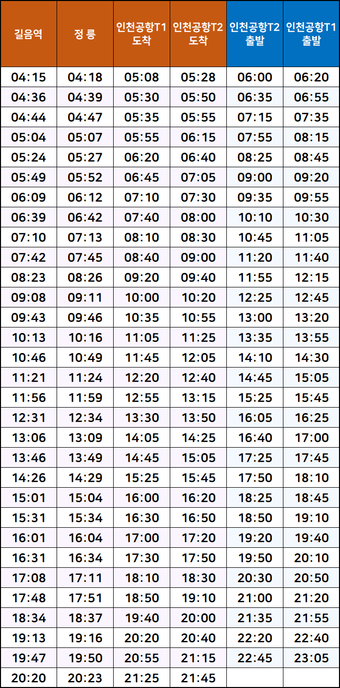 인천공항T2 → 인천공항 → 정릉(도심공항) → 길음역(종암동) → 홀리데이인성북 → 숭례초교 → 미아사거리 → 미아역 → 수유리 → 쌍문역