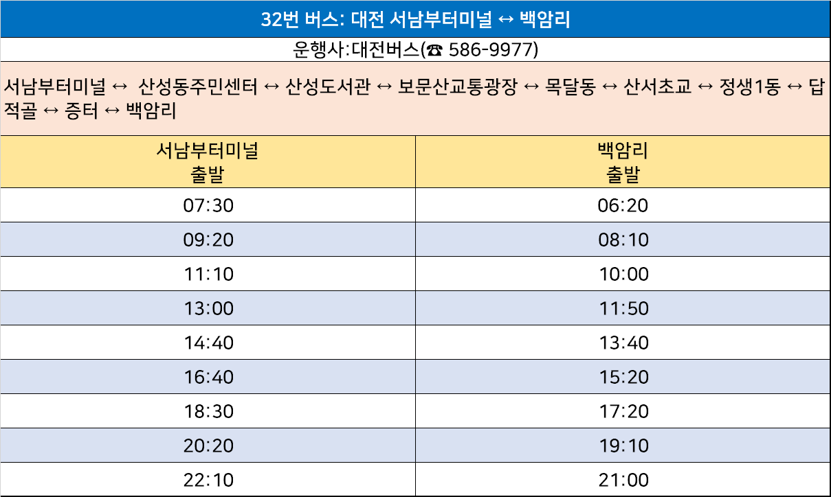 32번 버스: 대전 서남부터미널 ↔ 백암리