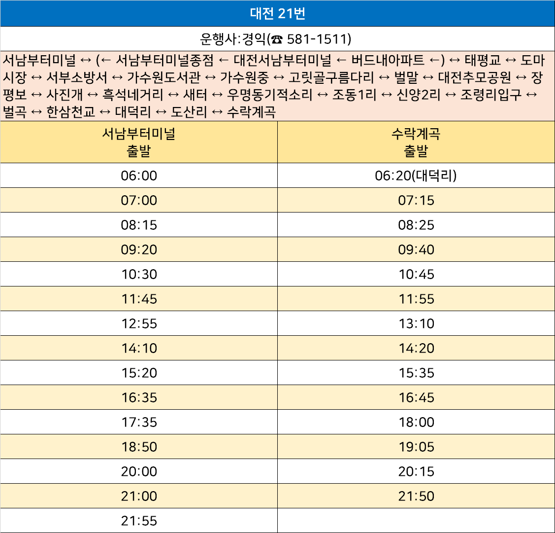 대전 21번: 서남부터미널 ↔ (← 서남부터미널종점 ← 대전서남부터미널 ← 버드내아파트 ←) ↔ 태평교 ↔ 도마시장 ↔ 서부소방서 ↔ 가수원도서관 ↔ 가수원중 ↔ 고릿골구름다리 ↔ 벌말 ↔ 대전추모공원 ↔ 장평보 ↔ 사진개 ↔ 흑석네거리 ↔ 새터 ↔ 우명동기적소리 ↔ 조동1리 ↔ 신양2리 ↔ 조령리입구 ↔ 벌곡 ↔ 한삼천교 ↔ 대덕리 ↔ 도산리 ↔ 수락계곡