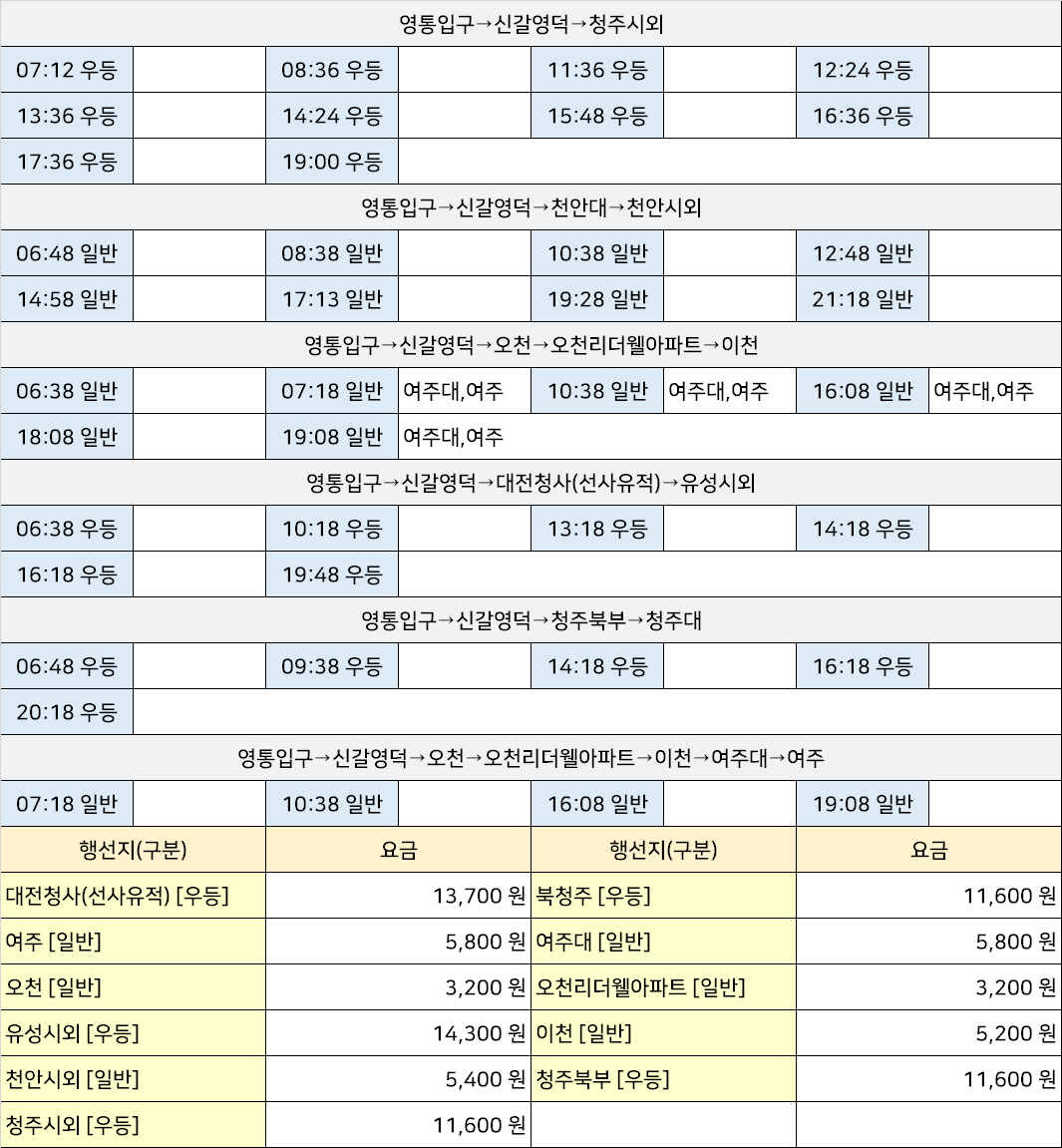 아주대시외고속버스터미널 아주대정류장 아주대정류소 → "영통입구→신갈영덕→대전청사(선사유적)→유성시외,영통입구→신갈영덕→오천→오천리더웰아파트→이천→여주대→여주,영통입구→신갈영덕→천안대→천안시외,영통입구→신갈영덕→청주북부→청주대,영통입구→신갈영덕→청주시외".