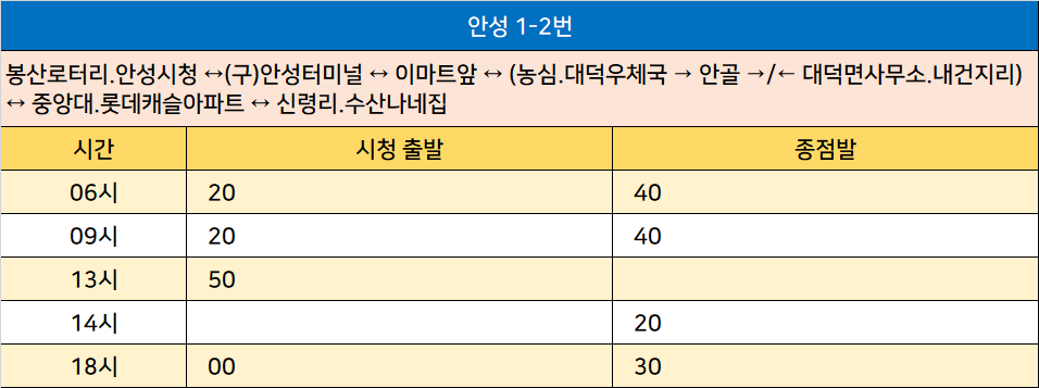 안성 1-2번: 봉산로터리.안성시청 ↔(구)안성터미널 ↔ 이마트앞 ↔ (농심.대덕우체국 → 안골 →/← 대덕면사무소.내건지리) ↔ 중앙대.롯데캐슬아파트 ↔ 신령리.수산나네집