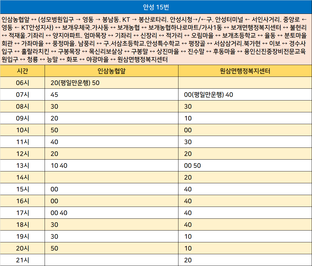 안성 15번: 인삼농협앞 ↔ (성모병원입구 → 영동 → 봉남동. KT → 봉산로타리. 안성시청→/←구. 안성터미널 ← 서인사거리. 중앙로 ← 영동 ← KT안성지사) ↔ 보개우체국.가사동 ↔ 보개농협 ↔ 보개농협하나로마트/가사1동 ↔ 보개면행정복지센터 ↔ 불현리 ↔ 적재울.기좌리 ↔ 양지아파트. 엄마목장 ↔ 기좌리 ↔ 신장리 ↔ 적가리 ↔ 오림마을 ↔ 보개초등학교 ↔ 율동 ↔ 분토마을회관 ↔ 가좌마을 ↔ 풍정마을. 남풍리 ↔ 구.서삼초등학교.안성특수학교 ↔ 평장골 ↔ 서삼삼거리.북가현 ↔ 이보 ↔ 경수사입구 ↔ 훌랄라치킨 ↔ 구봉목장 ↔ 목신리보살상 ↔ 구봉말 ↔ 상진마을 ↔ 진수말 ↔ 후동마을 ↔ 용인신진중장비전문교육원입구 ↔ 청룡 ↔ 능말 ↔ 화포 ↔ 야광마을 ↔ 원삼면행정복지센터