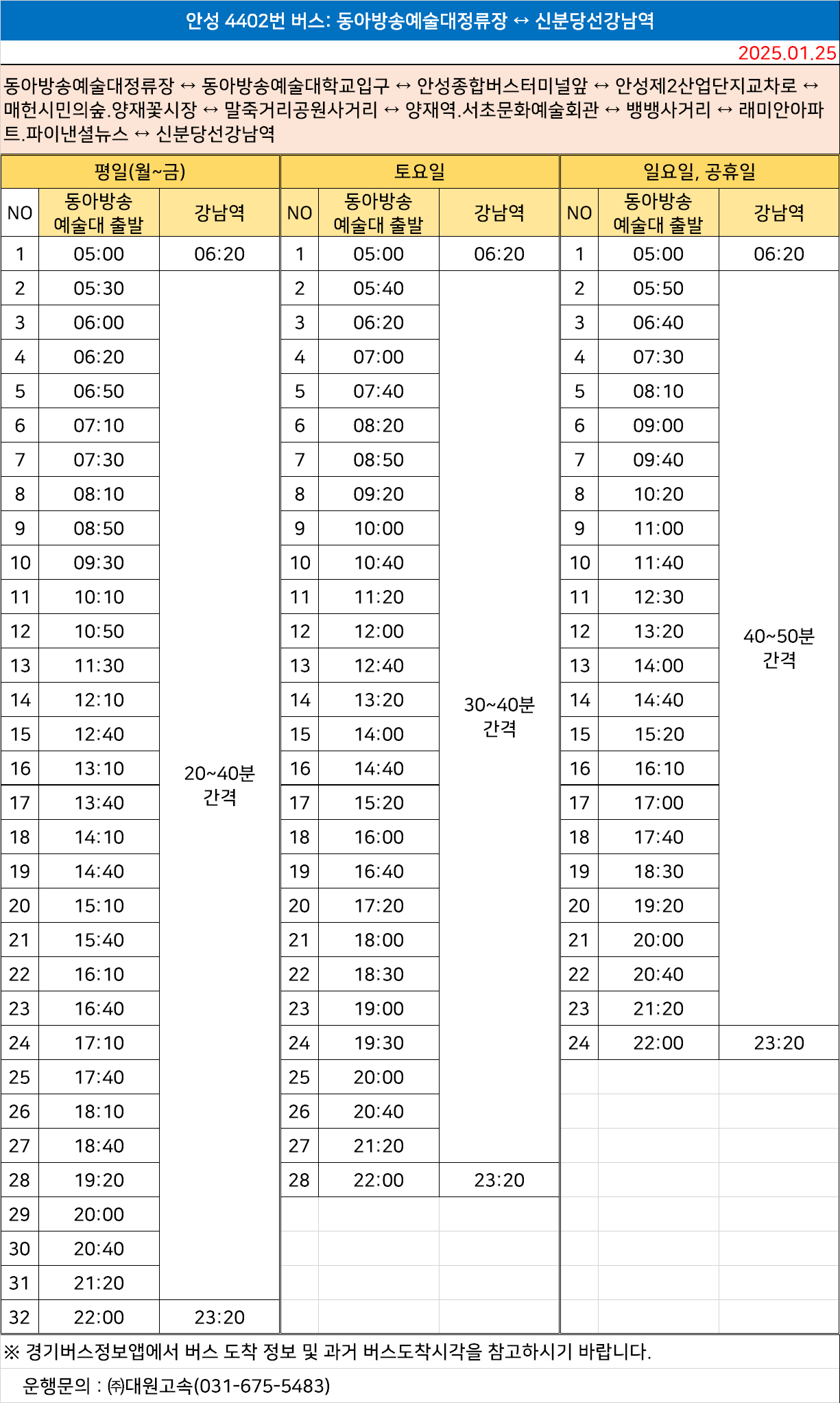 안성 4402번: 동아방송예술대정류장 ↔ 동아방송예술대학교입구 ↔ 안성종합버스터미널앞 ↔ 안성제2산업단지교차로 ↔ 매헌시민의숲.양재꽃시장 ↔ 말죽거리공원사거리 ↔ 양재역.서초문화예술회관 ↔ 뱅뱅사거리 ↔ 래미안아파트.파이낸셜뉴스 ↔ 신분당선강남역