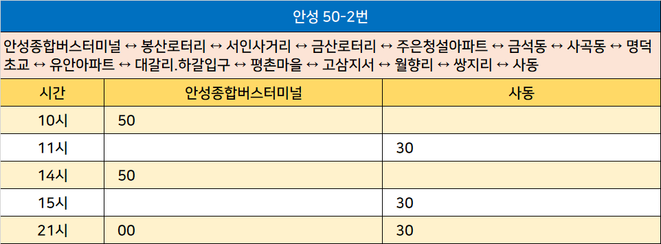 안성 50-2번: 안성종합버스터미널 ↔ 봉산로터리 ↔ 서인사거리 ↔ 금산로터리 ↔ 주은청설아파트 ↔ 금석동 ↔ 사곡동 ↔ 명덕초교 ↔ 유안아파트 ↔ 대갈리.하갈입구 ↔ 평촌마을 ↔ 고삼지서 ↔ 월향리 ↔ 쌍지리 ↔ 사동