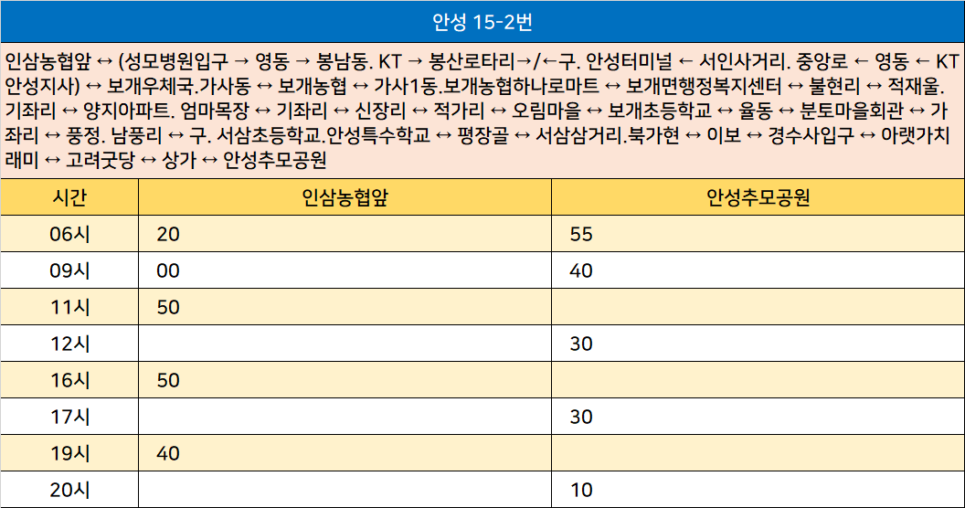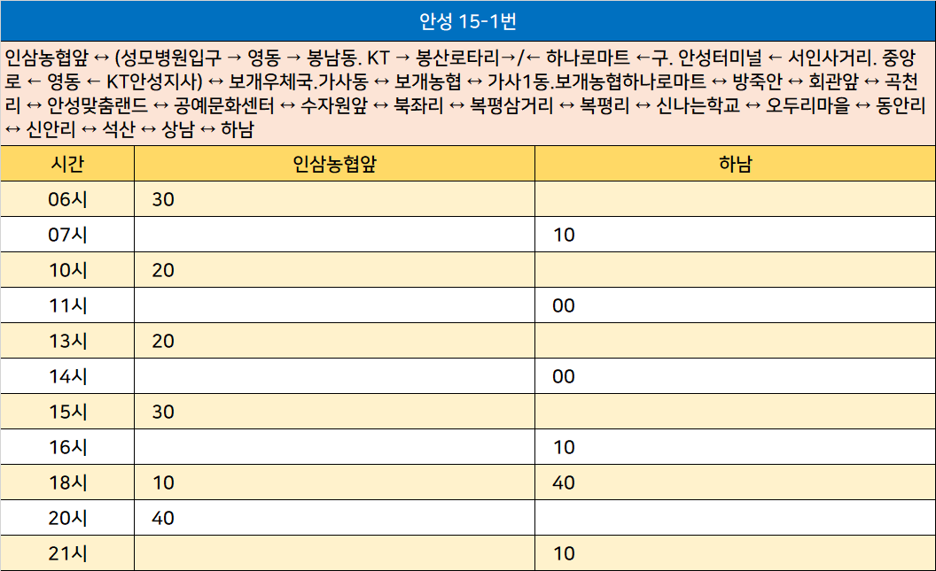 안성 15-1번: 인삼농협앞 ↔ (성모병원입구 → 영동 → 봉남동. KT → 봉산로타리→/← 하나로마트 ←구. 안성터미널 ← 서인사거리. 중앙로 ← 영동 ← KT안성지사) ↔ 보개우체국.가사동 ↔ 보개농협 ↔ 가사1동.보개농협하나로마트 ↔ 방죽안 ↔ 회관앞 ↔ 곡천리 ↔ 안성맞춤랜드 ↔ 공예문화센터 ↔ 수자원앞 ↔ 북좌리 ↔ 복평삼거리 ↔ 복평리 ↔ 신나는학교 ↔ 오두리마을 ↔ 동안리 ↔ 신안리 ↔ 석산 ↔ 상남 ↔ 하남