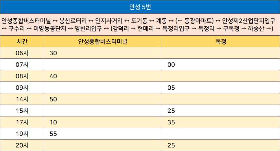 안성 5번: 안성종합버스터미널 ↔ 봉산로터리 ↔ 인지사거리 ↔ 도기동 ↔ 계동 ↔ (← 동광아파트) ↔ 안성제2산업단지입구 ↔ 구수리 ↔ 미양농공단지 ↔ 양변리입구 ↔ (강덕리 → 현매리 → 독정리입구 → 독정리 → 구독정 → 하송산 →)