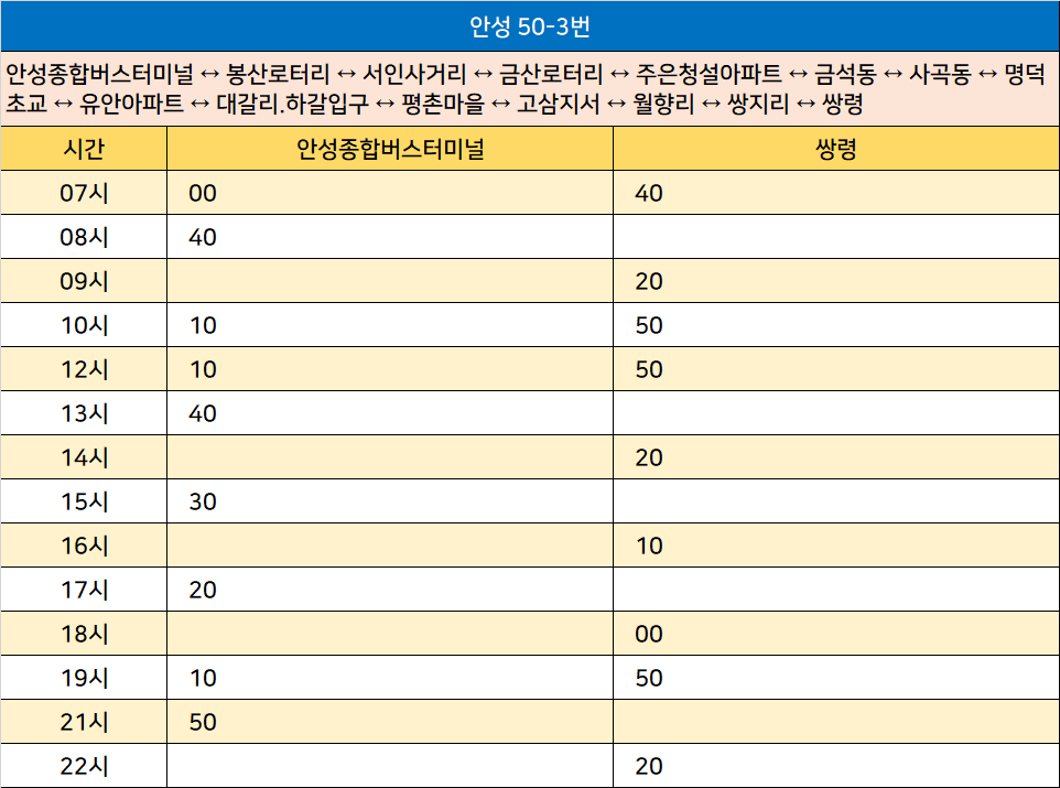 안성 50-3번: 안성종합버스터미널 ↔ 봉산로터리 ↔ 서인사거리 ↔ 금산로터리 ↔ 주은청설아파트 ↔ 금석동 ↔ 사곡동 ↔ 명덕초교 ↔ 유안아파트 ↔ 대갈리.하갈입구 ↔ 평촌마을 ↔ 고삼지서 ↔ 월향리 ↔ 쌍지리 ↔ 쌍령