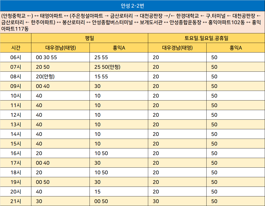 안성 2-2번: (안청중학교 ←) ↔ 태영아파트 ↔ (주은청설아파트 → 금산로터리 → 대천공판장 →/← 한경대학교 ← 구.터미널 ← 대천공판장 ← 금산로터리 ← 한주아파트) ↔ 봉산로터리 ↔ 안성종합버스터미널 ↔ 보개도서관 ↔ 안성종합운동장 ↔ 홍익아파트102동 ↔ 홍익아파트117동