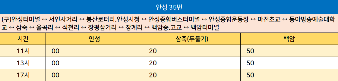 안성 35번: (구)안성터미널 ↔ 서인사거리 ↔ 봉산로터리.안성시청 ↔ 안성종합버스터미널 ↔ 안성종합운동장 ↔ 마전초교 ↔ 동아방송예술대학교 ↔ 삼죽 ↔ 율곡리 ↔ 석천리 ↔ 장평삼거리 ↔ 장계리 ↔ 백암중.고교 ↔ 백암터미널