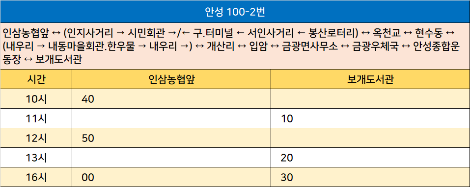 안성 100-2번: 인삼농협앞 ↔ (인지사거리 → 시민회관 →/← 구.터미널 ← 서인사거리 ← 봉산로터리) ↔ 옥천교 ↔ 현수동 ↔ (내우리 → 내동마을회관.한우물 → 내우리 →) ↔ 개산리 ↔ 입암 ↔ 금광면사무소 ↔ 금광우체국 ↔ 안성종합운동장 ↔ 보개도서관