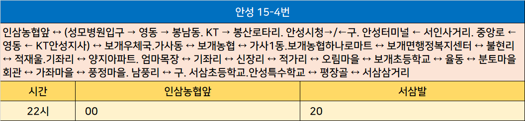 안성 15-4번: 인삼농협앞 ↔ (성모병원입구 → 영동 → 봉남동. KT → 봉산로타리. 안성시청→/←구. 안성터미널 ← 서인사거리. 중앙로 ← 영동 ← KT안성지사) ↔ 보개우체국.가사동 ↔ 보개농협 ↔ 가사1동.보개농협하나로마트 ↔ 보개면행정복지센터 ↔ 불현리 ↔ 적재울.기좌리 ↔ 양지아파트. 엄마목장 ↔ 기좌리 ↔ 신장리 ↔ 적가리 ↔ 오림마을 ↔ 보개초등학교 ↔ 율동 ↔ 분토마을회관 ↔ 가좌마을 ↔ 풍정마을. 남풍리 ↔ 구. 서삼초등학교.안성특수학교 ↔ 평장골 ↔ 서삼삼거리