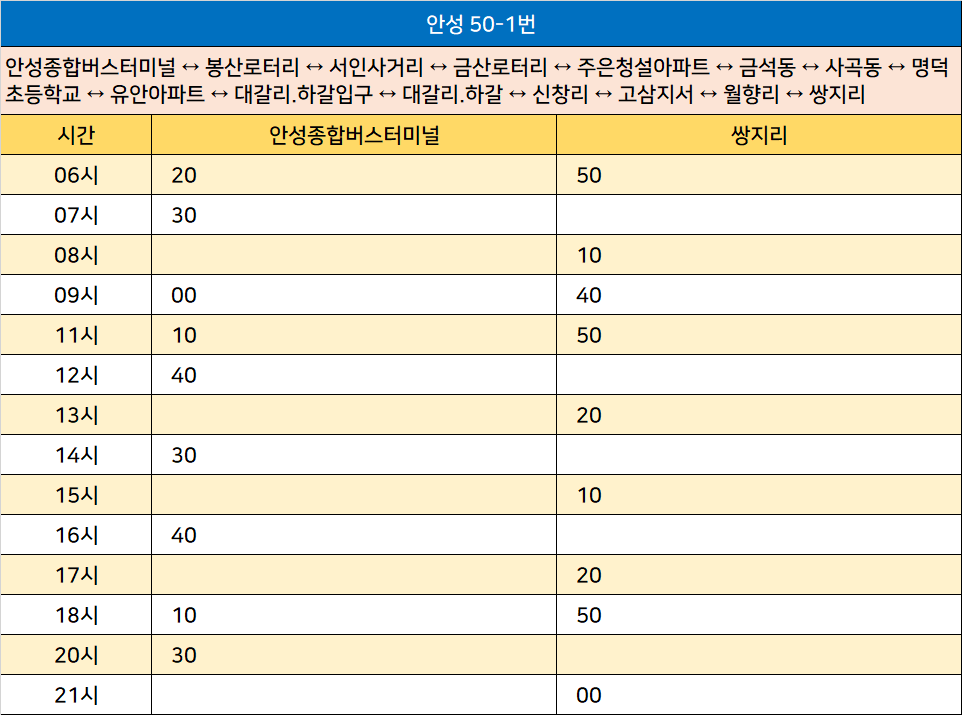 안성 50-1번: 안성종합버스터미널 ↔ 봉산로터리 ↔ 서인사거리 ↔ 금산로터리 ↔ 주은청설아파트 ↔ 금석동 ↔ 사곡동 ↔ 명덕초등학교 ↔ 유안아파트 ↔ 대갈리.하갈입구 ↔ 대갈리.하갈 ↔ 신창리 ↔ 고삼지서 ↔ 월향리 ↔ 쌍지리