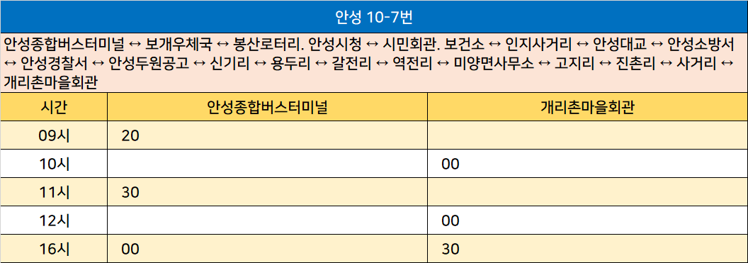 안성 10-7번: 안성종합버스터미널 ↔ 보개우체국 ↔ 봉산로터리. 안성시청 ↔ 시민회관. 보건소 ↔ 인지사거리 ↔ 안성대교 ↔ 안성소방서 ↔ 안성경찰서 ↔ 안성두원공고 ↔ 신기리 ↔ 용두리 ↔ 갈전리 ↔ 역전리 ↔ 미양면사무소 ↔ 고지리 ↔ 진촌리 ↔ 사거리 ↔ 개리촌마을회관
