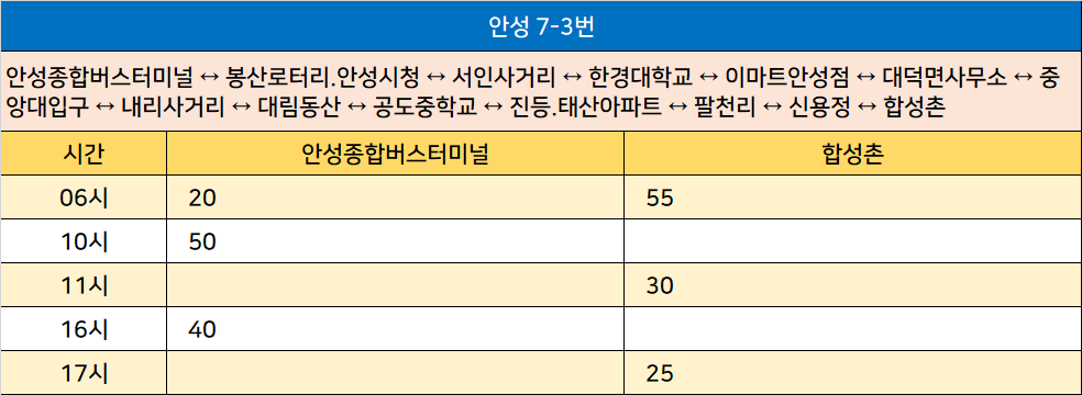 안성 7-3번: 안성종합버스터미널 ↔ 봉산로터리.안성시청 ↔ 서인사거리 ↔ 한경대학교 ↔ 이마트안성점 ↔ 대덕면사무소 ↔ 중앙대입구 ↔ 내리사거리 ↔ 대림동산 ↔ 공도중학교 ↔ 진등.태산아파트 ↔ 팔천리 ↔ 신용정 ↔ 합성촌