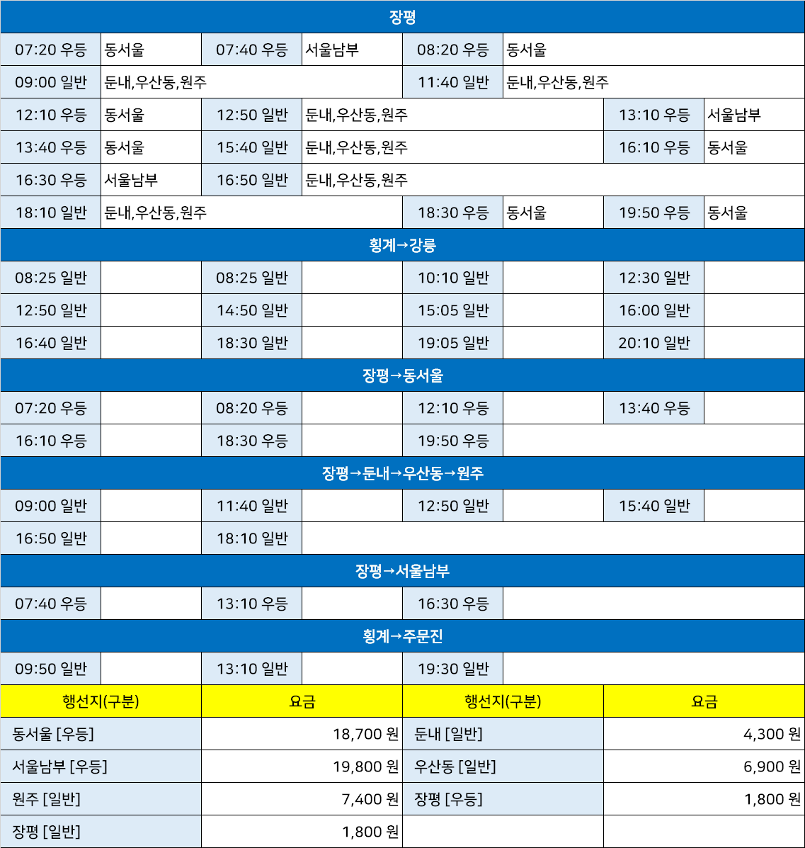 | 장평시외고속버스터미널 시간표 [장평정류소 장평정류장 용평면터미널 장평리터미널] (0) | 2025.03.27 |