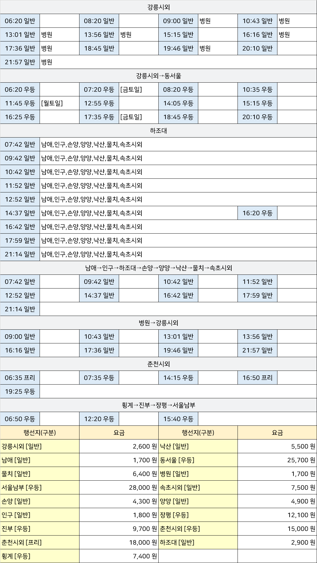 주문진 시외버스 터미널 시간표/요금표 2025년 08월 24일 기준