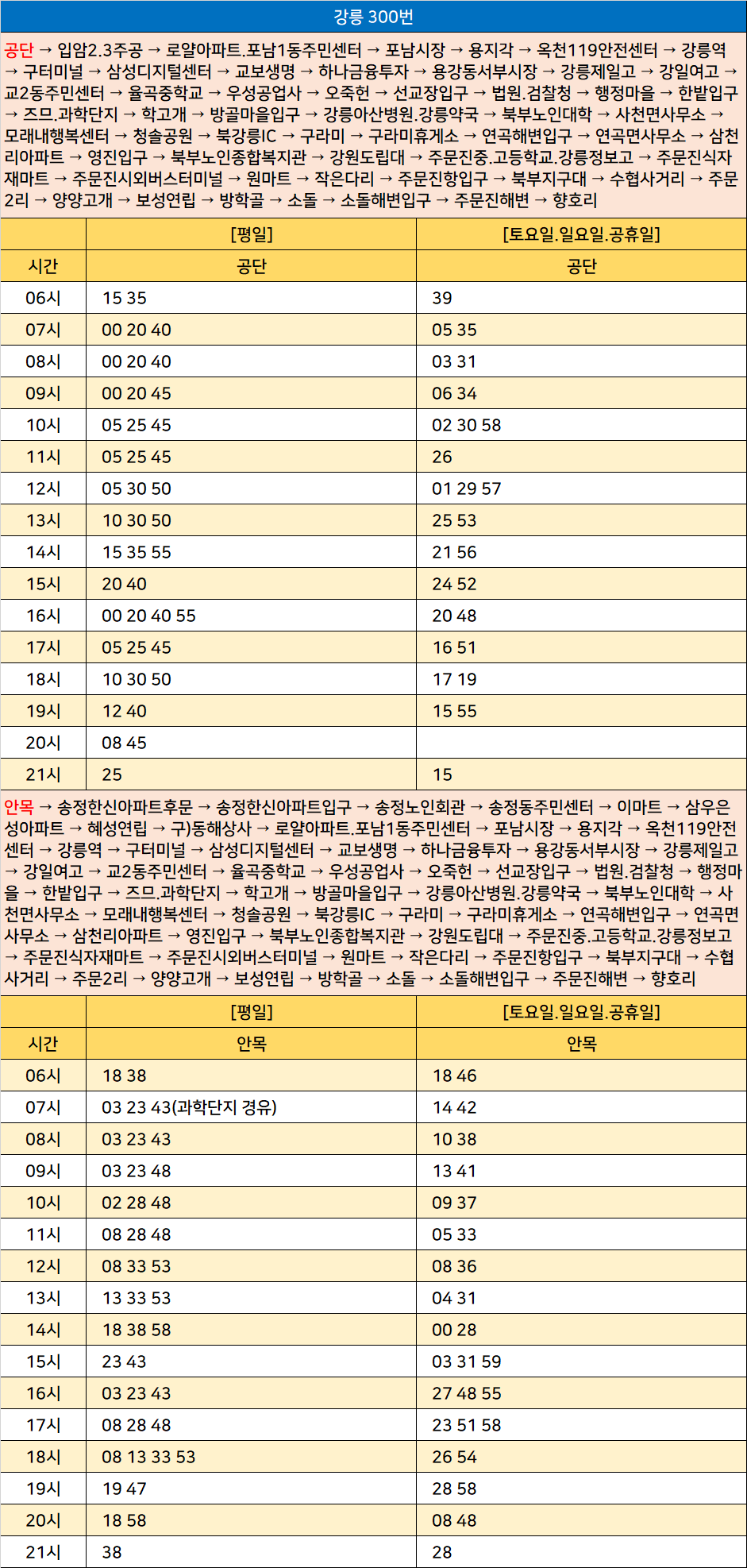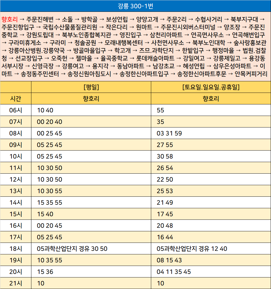 강릉 300-1번: 향호리 → 주문진해변 → 소돌 → 방학골 → 보성연립 → 양양고개 → 주문2리 → 수협사거리 → 북부지구대 → 주문진항입구 → 국립수산물품질관리원 → 작은다리 → 원마트 → 주문진시외버스터미널 → 양조장 → 주문진중학교 → 강원도립대 → 북부노인종합복지관 → 영진입구 → 삼천리아파트 → 연곡면사무소 → 연곡해변입구 → 구라미휴게소 → 구라미 → 청솔공원 → 모래내행복센터 → 사천면사무소 → 북부노인대학 → 숲사랑홍보관 → 강릉아산병원.강릉약국 → 방골마을입구 → 학고개 → 즈므.과학단지 → 한밭입구 → 행정마을 → 법원.검찰청 → 선교장입구 → 오죽헌 → 젤마을 → 율곡중학교 → 롯데캐슬아파트 → 강일여고 → 강릉제일고 → 용강동서부시장 → 신영극장 → 강릉여고 → 용지각 → 동남아파트 → 남강초교 → 혜성연립 → 삼우은성아파트 → 이마트 → 송정동주민센터 → 송정신원아침도시 → 송정한신아파트입구 → 송정한신아파트후문 → 안목커피거리