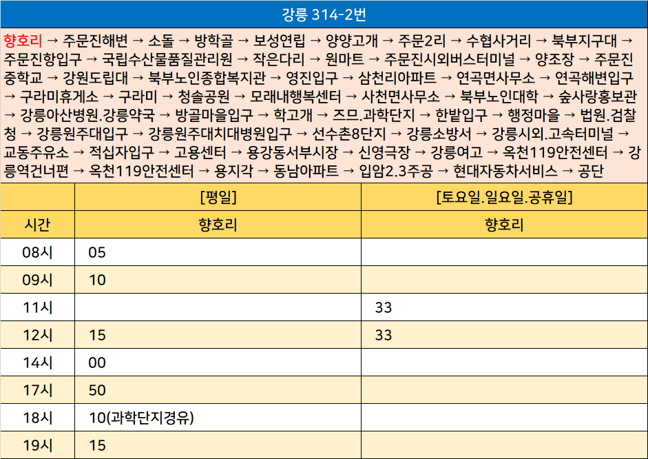 강릉 314-2번: 향호리 → 주문진해변 → 소돌 → 방학골 → 보성연립 → 양양고개 → 주문2리 → 수협사거리 → 북부지구대 → 주문진항입구 → 국립수산물품질관리원 → 작은다리 → 원마트 → 주문진시외버스터미널 → 양조장 → 주문진중학교 → 강원도립대 → 북부노인종합복지관 → 영진입구 → 삼천리아파트 → 연곡면사무소 → 연곡해변입구 → 구라미휴게소 → 구라미 → 청솔공원 → 모래내행복센터 → 사천면사무소 → 북부노인대학 → 숲사랑홍보관 → 강릉아산병원.강릉약국 → 방골마을입구 → 학고개 → 즈므.과학단지 → 한밭입구 → 행정마을 → 법원.검찰청 → 강릉원주대입구 → 강릉원주대치대병원입구 → 선수촌8단지 → 강릉소방서 → 강릉시외.고속터미널 → 교동주유소 → 적십자입구 → 고용센터 → 용강동서부시장 → 신영극장 → 강릉여고 → 옥천119안전센터 → 강릉역건너편 → 옥천119안전센터 → 용지각 → 동남아파트 → 입암2.3주공 → 현대자동차서비스 → 공단