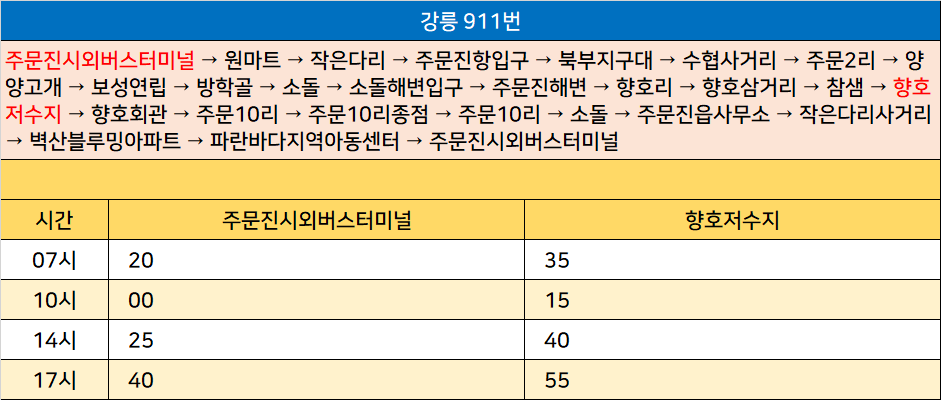 강릉 911번: 주문진시외버스터미널 → 원마트 → 작은다리 → 주문진항입구 → 북부지구대 → 수협사거리 → 주문2리 → 양양고개 → 보성연립 → 방학골 → 소돌 → 소돌해변입구 → 주문진해변 → 향호리 → 향호삼거리 → 참샘 → 향호저수지 → 향호회관 → 주문10리 → 주문10리종점 → 주문10리 → 소돌 → 주문진읍사무소 → 작은다리사거리 → 벽산블루밍아파트 → 파란바다지역아동센터 → 주문진시외버스터미널