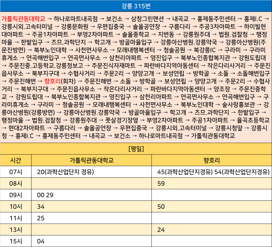 강릉 315번: 가톨릭관동대학교 → 하나로마트내곡점 → 보건소 → 삼창그린맨션 → 내곡교 → 홍제동주민센터 → 홍제I.C → 강릉시외.고속터미널 → 강릉문화원 → 우편집중국 → 솔올공연장 → 구름다리 → 주공3차아파트 → 하이빌현대아파트 → 주공1차아파트 → 부영2차아파트 → 솔올중학교 → 지변동 → 강릉원주대 → 법원.검찰청 → 행정마을 → 한밭입구 → 즈므.과학단지 → 학고개 → 방골마을입구 → 강릉아산병원.강릉약국 → 강릉아산병원(주문진방면) → 북부노인대학 → 사천면사무소 → 모래내행복센터 → 청솔공원 → 북강릉IC → 구라미 → 구라미휴게소 → 연곡해변입구 → 연곡면사무소 → 삼천리아파트 → 영진입구 → 북부노인종합복지관 → 강원도립대 → 주문진중.고등학교.강릉정보고 → 주문진식자재마트 → 파란바다지역아동센터 → 작은다리사거리 → 주문진읍사무소 → 북부지구대 → 수협사거리 → 주문2리 → 양양고개 → 보성연립 → 방학골 → 소돌 → 소돌해변입구 → 주문진해변 → 향호리(회차) → 주문진해변 → 소돌 → 방학골 → 보성연립 → 양양고개 → 주문2리 → 수협사거리 → 북부지구대 → 주문진읍사무소 → 작은다리사거리 → 파란바다지역아동센터 → 양조장 → 주문진중학교 → 강원도립대 → 북부노인종합복지관 → 영진입구 → 삼천리아파트 → 연곡면사무소 → 연곡해변입구 → 구라미휴게소 → 구라미 → 청솔공원 → 모래내행복센터 → 사천면사무소 → 북부노인대학 → 숲사랑홍보관 → 강릉아산병원(강릉방면) → 강릉아산병원.강릉약국 → 방골마을입구 → 학고개 → 즈므.과학단지 → 한밭입구 → 행정마을 → 법원.검찰청 → 강릉원주대 → 풋살경기장옆 → 부영2차아파트 → 주공1차아파트 → 율곡초등학교 → 현대2차아파트 → 구름다리 → 솔올공연장 → 우편집중국 → 강릉시외.고속터미널 → 강릉시청앞 → 강릉시청 → 홍제I.C → 홍제동주민센터 → 내곡교 → 보건소 → 하나로마트내곡점 → 가톨릭관동대학교