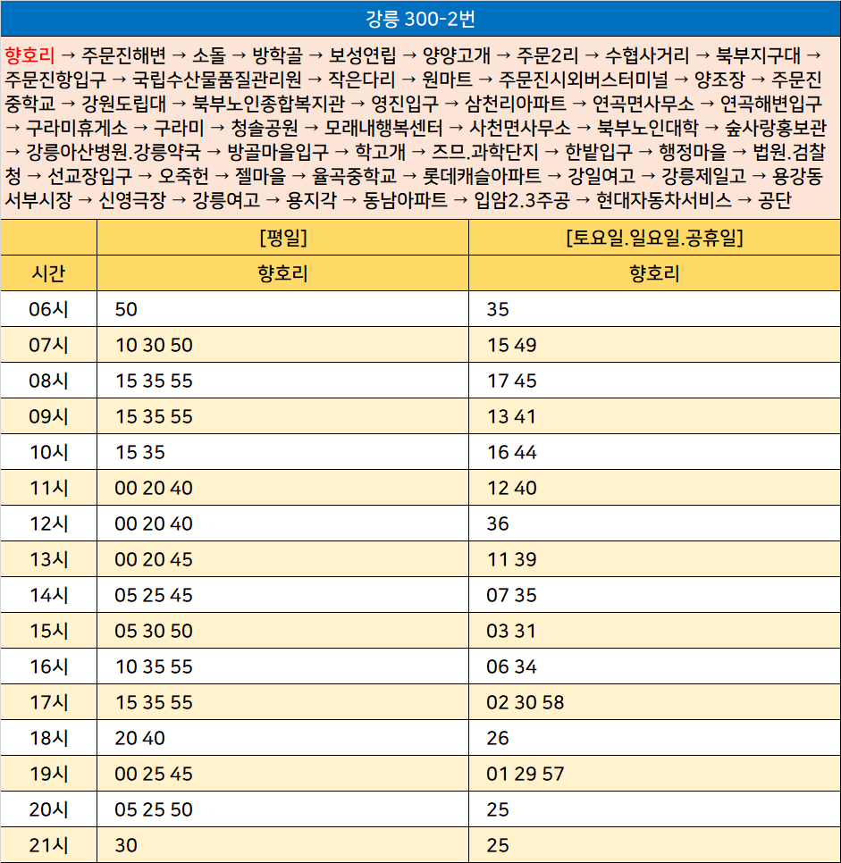 강릉 300-2번: 향호리 → 주문진해변 → 소돌 → 방학골 → 보성연립 → 양양고개 → 주문2리 → 수협사거리 → 북부지구대 → 주문진항입구 → 국립수산물품질관리원 → 작은다리 → 원마트 → 주문진시외버스터미널 → 양조장 → 주문진중학교 → 강원도립대 → 북부노인종합복지관 → 영진입구 → 삼천리아파트 → 연곡면사무소 → 연곡해변입구 → 구라미휴게소 → 구라미 → 청솔공원 → 모래내행복센터 → 사천면사무소 → 북부노인대학 → 숲사랑홍보관 → 강릉아산병원.강릉약국 → 방골마을입구 → 학고개 → 즈므.과학단지 → 한밭입구 → 행정마을 → 법원.검찰청 → 선교장입구 → 오죽헌 → 젤마을 → 율곡중학교 → 롯데캐슬아파트 → 강일여고 → 강릉제일고 → 용강동서부시장 → 신영극장 → 강릉여고 → 용지각 → 동남아파트 → 입암2.3주공 → 현대자동차서비스 → 공단