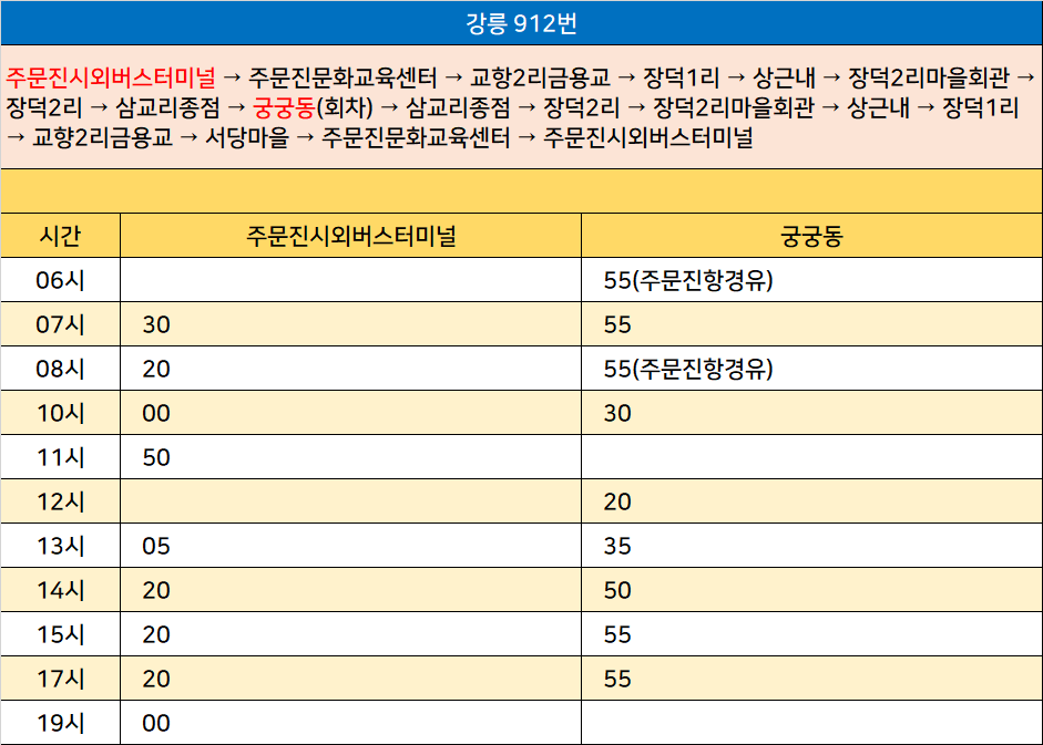 강릉 912번: 주문진시외버스터미널 → 주문진문화교육센터 → 교항2리금용교 → 장덕1리 → 상근내 → 장덕2리마을회관 → 장덕2리 → 삼교리종점 → 궁궁동(회차) → 삼교리종점 → 장덕2리 → 장덕2리마을회관 → 상근내 → 장덕1리 → 교향2리금용교 → 서당마을 → 주문진문화교육센터 → 주문진시외버스터미널