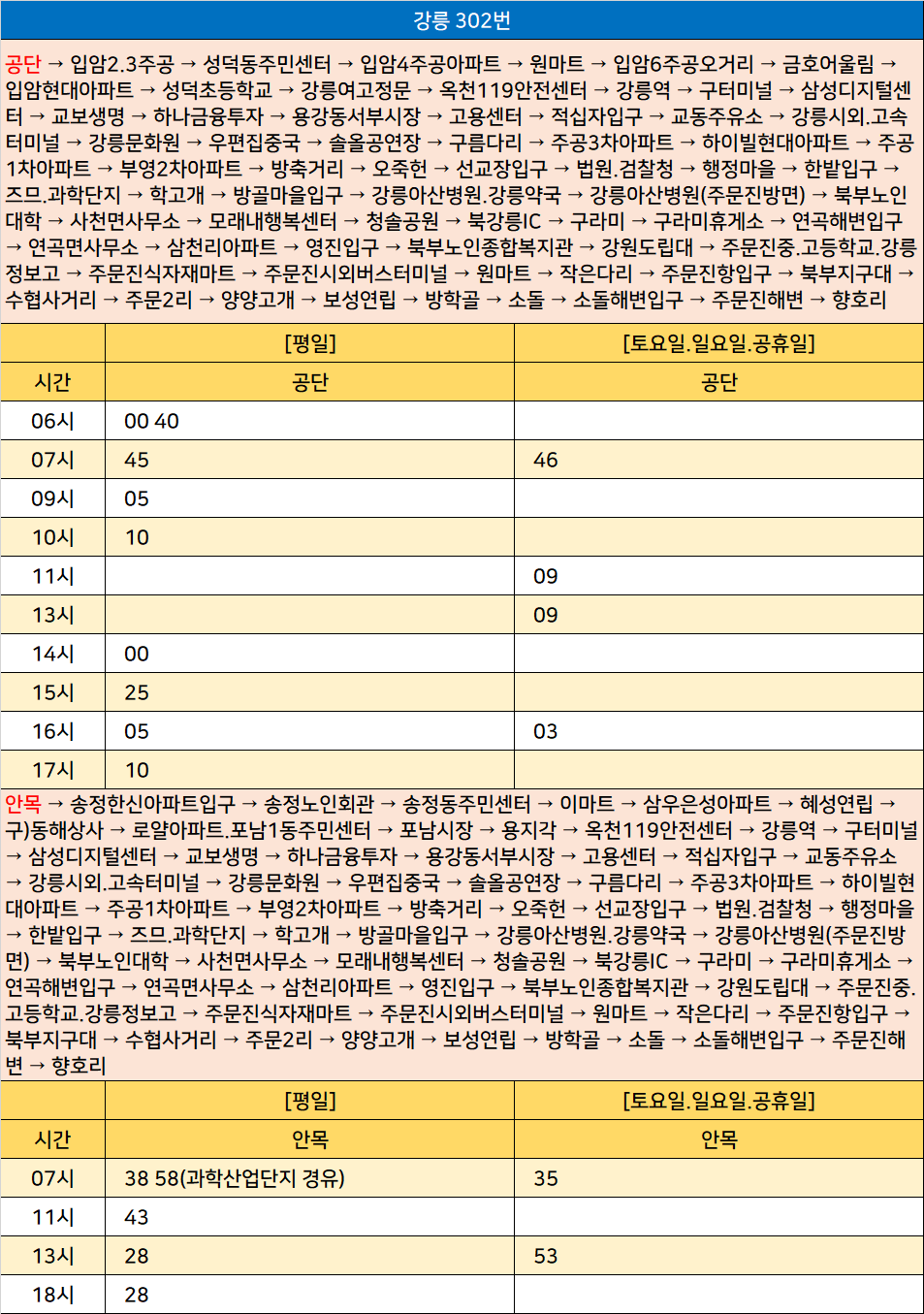 강릉 302-1번: 향호리 → 주문진해변 → 소돌 → 보성연립 → 양양고개 → 주문2리 → 수협사거리 → 북부지구대 → 주문진항입구 → 국립수산물품질관리원 → 작은다리 → 원마트 → 주문진시외버스터미널 → 양조장 → 주문진중학교 → 강원도립대 → 북부노인종합복지관 → 영진입구 → 삼천리아파트 → 연곡면사무소 → 연곡해변입구 → 구라미휴게소 → 구라미 → 청솔공원 → 모래내행복센터 → 사천면사무소 → 북부노인대학 → 숲사랑홍보관 → 강릉아산병원(강릉방면) → 강릉아산병원.강릉약국 → 방골마을입구 → 학고개 → 즈므.과학단지 → 한밭입구 → 행정마을 → 법원.검찰청 → 선교장입구 → 오죽헌 → 방축거리 → 부영2차아파트 → 주공1차아파트 → 율곡초등학교 → 현대2차아파트 → 구름다리 → 솔올공연장 → 우편집중국 → 강릉시외.고속터미널 → 교동주유소 → 적십자입구 → 고용센터 → 용강동서부시장 → 신영극장 → 강릉여고 → 용지각 → 동남아파트 → 남강초교 → 혜성연립 → 삼우은성아파트 → 이마트 → 송정동주민센터 → 송정신원아침도시 → 송정한신아파트입구 → 송정한신아파트후문 → 안목커피거리