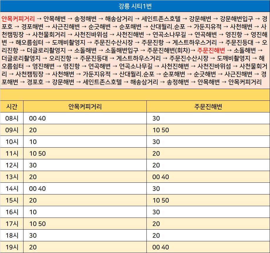강릉 시티1번: 안목커피거리 → 안목해변 → 송정해변 → 해송삼거리 → 세인트존스호텔 → 강문해변 → 강문해변입구 → 경포호 → 경포해변 → 사근진해변 → 순긋해변 → 순포해변 → 산대월리.순포 → 가둔지유적 → 사천해변 → 사천캠핑장 → 사천물회거리 → 사천진바위섬 → 사천진해변 → 연곡소나무길 → 연곡해변 → 영진항 → 영진해변 → 해오름쉼터 → 도깨비촬영지 → 주문진수산시장 → 주문진항 → 게스트하우스거리 → 주문진등대 → 오리진항 → 더글로리촬영지 → 소돌해변 → 소돌해변입구 → 주문진해변(회차)→ 주문진해변 → 소돌해변 → 더글로리촬영지 → 오리진항 → 주문진등대 → 게스트하우스거리 → 주문진수산시장 → 도깨비촬영지 → 해오름쉼터 → 영진해변 → 영진항 → 연곡해변 → 연곡소나무길 → 사천진해변 → 사천진바위섬 → 사천물회거리 → 사천캠핑장 → 사천해변 → 가둔지유적 → 산대월리.순포 → 순포해변 → 순긋해변 → 사근진해변 → 경포해변 → 경포호 → 강문해변 → 세인트존스호텔 → 해송삼거리 → 송정해변 → 안목해변 → 안목커피거리