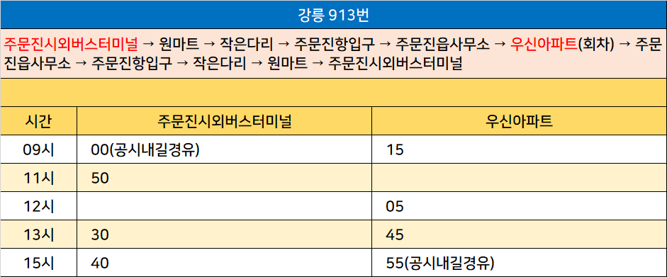 강릉 913번: 주문진시외버스터미널 → 원마트 → 작은다리 → 주문진항입구 → 주문진읍사무소 → 우신아파트(회차) → 주문진읍사무소 → 주문진항입구 → 작은다리 → 원마트 → 주문진시외버스터미널