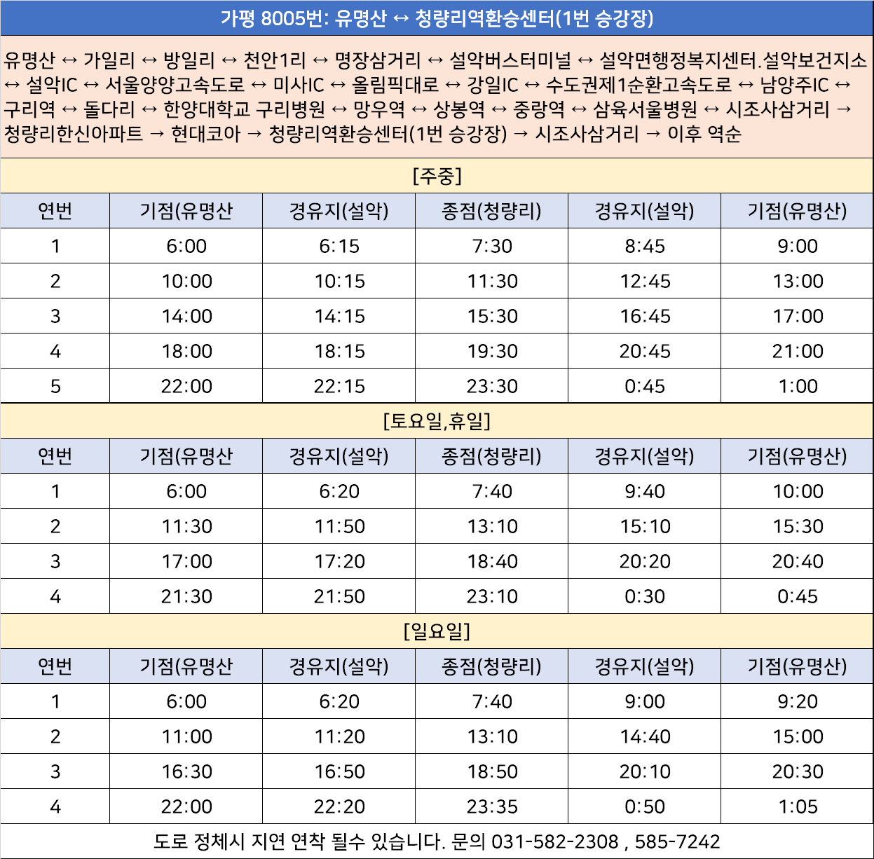 가평 8005번: 유명산 ↔ 청량리역환승센터(1번 승강장)