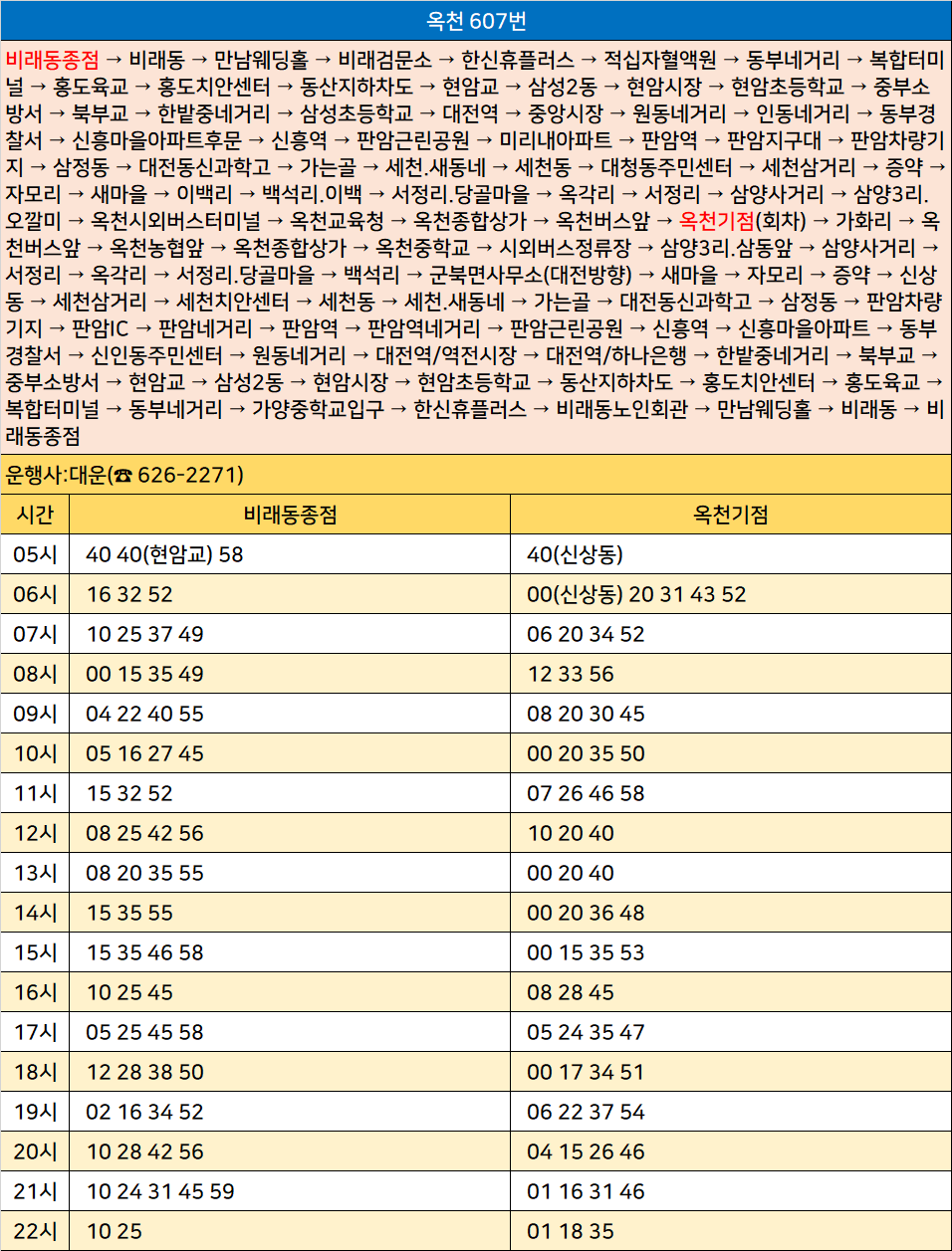 옥천 607번: 비래동종점 → 비래동 → 만남웨딩홀 → 비래검문소 → 한신휴플러스 → 적십자혈액원 → 동부네거리 → 복합터미널 → 홍도육교 → 홍도치안센터 → 동산지하차도 → 현암교 → 삼성2동 → 현암시장 → 현암초등학교 → 중부소방서 → 북부교 → 한밭중네거리 → 삼성초등학교 → 대전역 → 중앙시장 → 원동네거리 → 인동네거리 → 동부경찰서 → 신흥마을아파트후문 → 신흥역 → 판암근린공원 → 미리내아파트 → 판암역 → 판암지구대 → 판암차량기지 → 삼정동 → 대전동신과학고 → 가는골 → 세천.새동네 → 세천동 → 대청동주민센터 → 세천삼거리 → 증약 → 자모리 → 새마을 → 이백리 → 백석리.이백 → 서정리.당골마을 → 옥각리 → 서정리 → 삼양사거리 → 삼양3리.오깔미 → 옥천시외버스터미널 → 옥천교육청 → 옥천종합상가 → 옥천버스앞 → 옥천기점(회차) → 가화리 → 옥천버스앞 → 옥천농협앞 → 옥천종합상가 → 옥천중학교 → 시외버스정류장 → 삼양3리.삼동앞 → 삼양사거리 → 서정리 → 옥각리 → 서정리.당골마을 → 백석리 → 군북면사무소(대전방향) → 새마을 → 자모리 → 증약 → 신상동 → 세천삼거리 → 세천치안센터 → 세천동 → 세천.새동네 → 가는골 → 대전동신과학고 → 삼정동 → 판암차량기지 → 판암IC → 판암네거리 → 판암역 → 판암역네거리 → 판암근린공원 → 신흥역 → 신흥마을아파트 → 동부경찰서 → 신인동주민센터 → 원동네거리 → 대전역/역전시장 → 대전역/하나은행 → 한밭중네거리 → 북부교 → 중부소방서 → 현암교 → 삼성2동 → 현암시장 → 현암초등학교 → 동산지하차도 → 홍도치안센터 → 홍도육교 → 복합터미널 → 동부네거리 → 가양중학교입구 → 한신휴플러스 → 비래동노인회관 → 만남웨딩홀 → 비래동 → 비래동종점