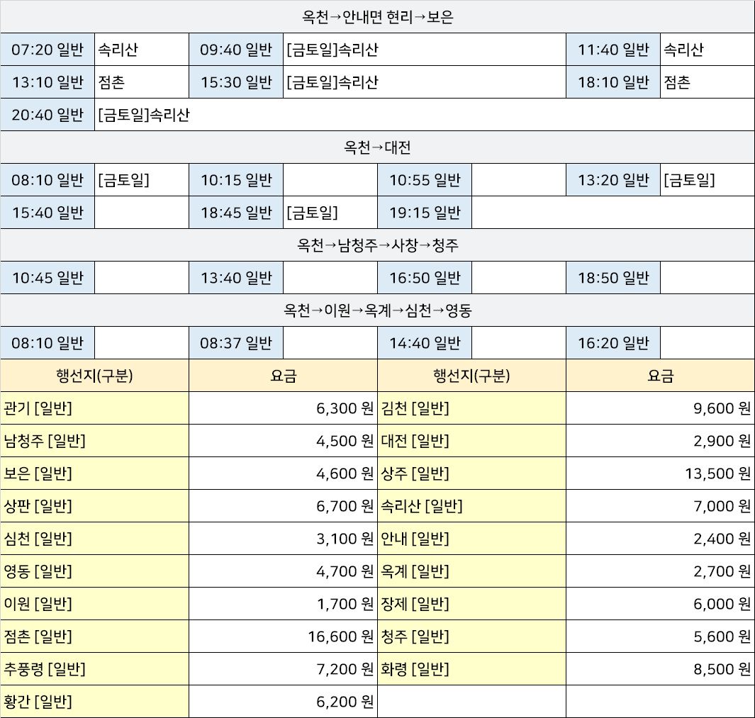 옥천 시외버스 정류장 시간표/요금표 2025년 06월 12일 기준