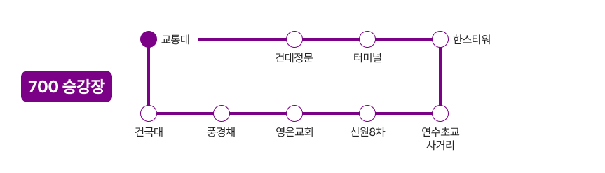 교통대→건국대→풍경채A→호암지구(힐데스하임APT입구)→용산신원8차APT→메가박스→한스타워→터미널→충주역→건국대→교통대