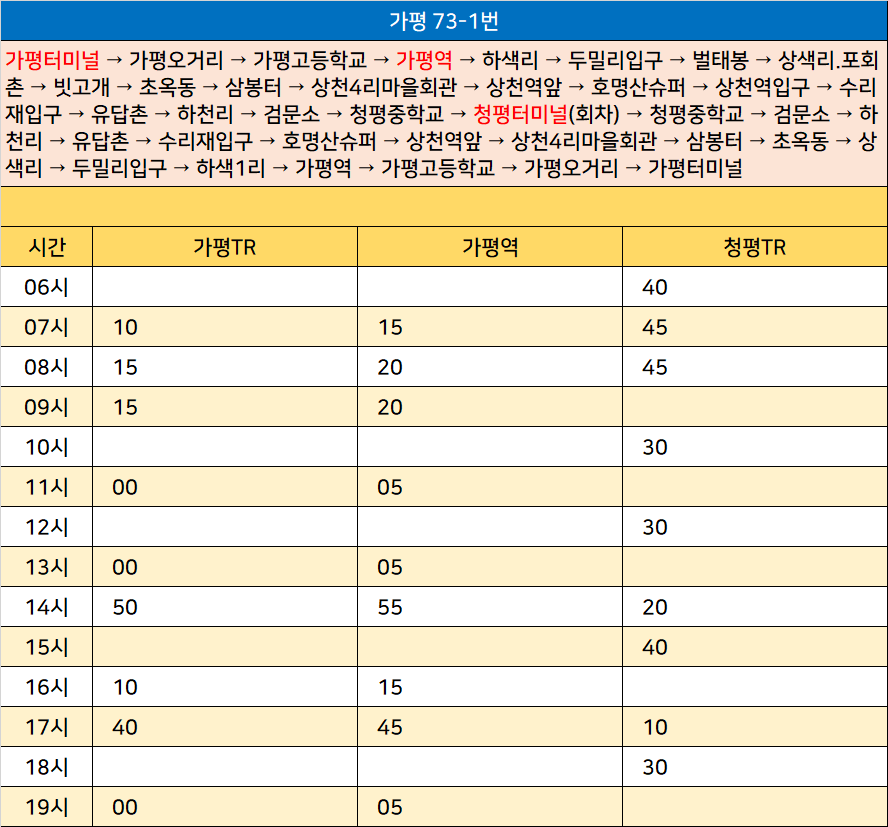 가평 73-1번: 가평터미널 → 가평오거리 → 가평고등학교 → 가평역 → 하색리 → 두밀리입구 → 벌태봉 → 상색리.포회촌 → 빗고개 → 초옥동 → 삼봉터 → 상천4리마을회관 → 상천역앞 → 호명산슈퍼 → 상천역입구 → 수리재입구 → 유답촌 → 하천리 → 검문소 → 청평중학교 → 청평터미널(회차) → 청평중학교 → 검문소 → 하천리 → 유답촌 → 수리재입구 → 호명산슈퍼 → 상천역앞 → 상천4리마을회관 → 삼봉터 → 초옥동 → 상색리 → 두밀리입구 → 하색1리 → 가평역 → 가평고등학교 → 가평오거리 → 가평터미널