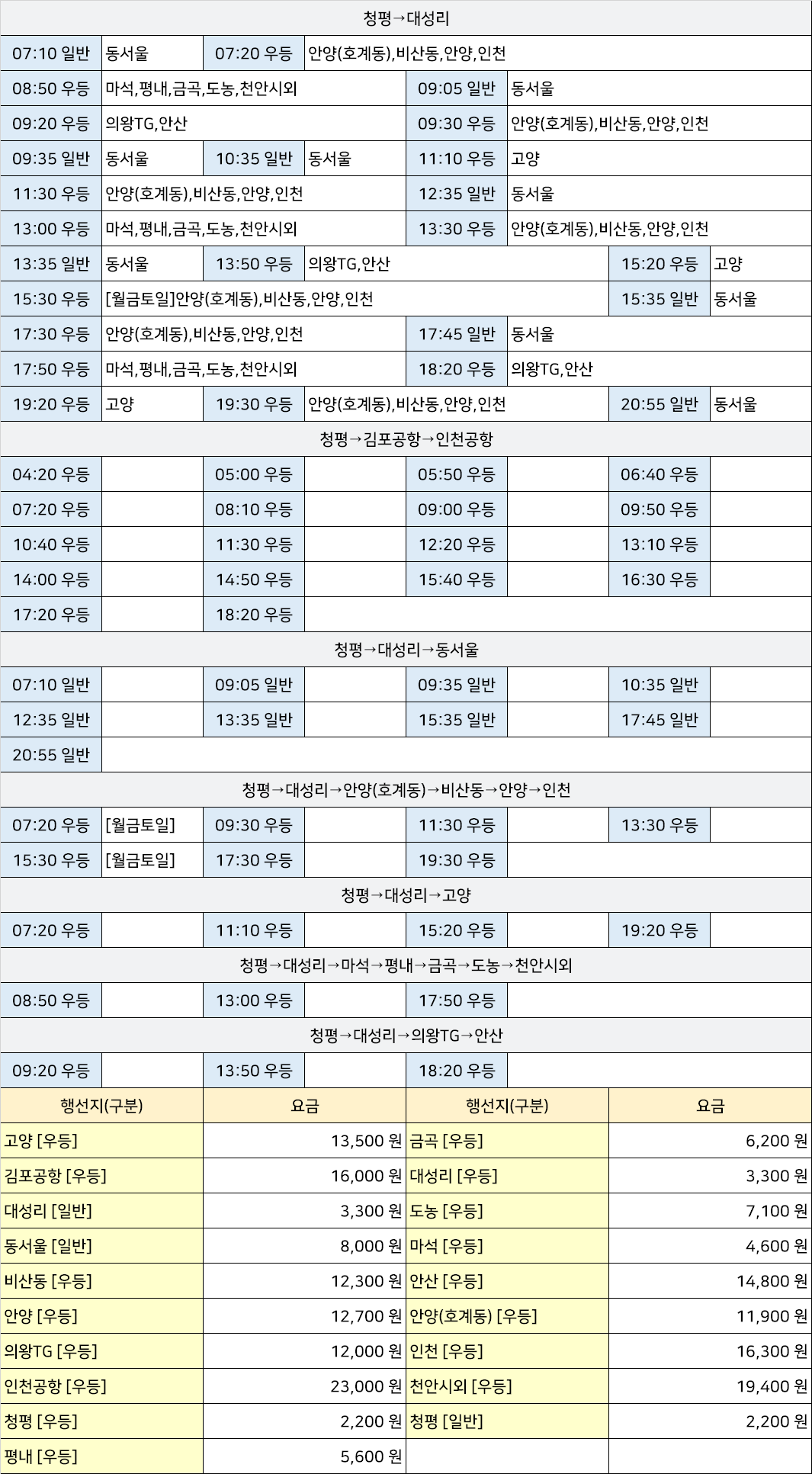 가평시외고속버스터미널 가평정류장 가평정류소 → "청평→김포공항→인천공항,청평→대성리→고양,청평→대성리→동서울,청평→대성리→마석→평내→금곡→도농→천안시외,청평→대성리→의왕TG→안산,청평→대성리→호계동→비산동→안양→인천".